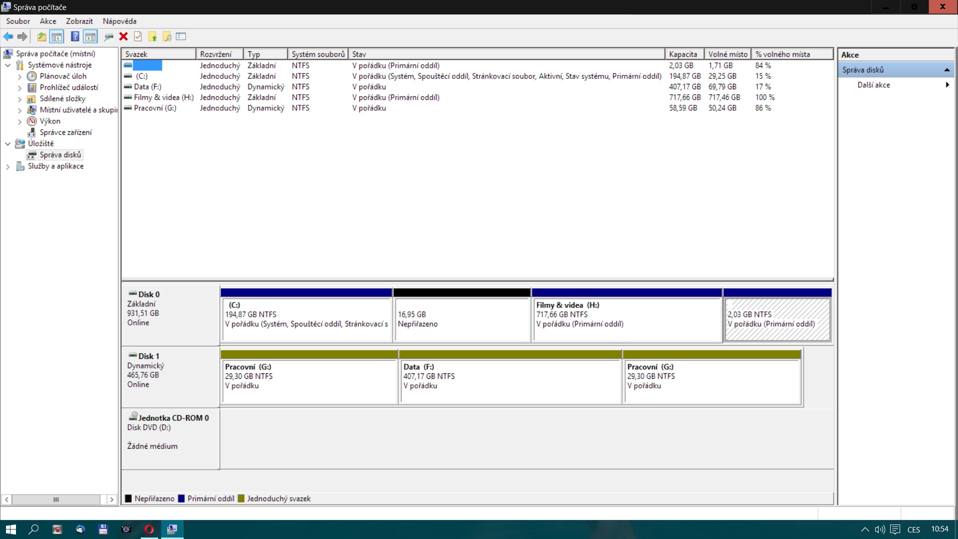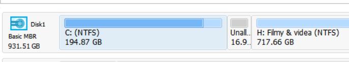 Na disku 1 mám oddíl C:\ se systémem a oddíl H:\, kde jsou filmy. Protože na C už začalo být těsno, zmenšil jsem H