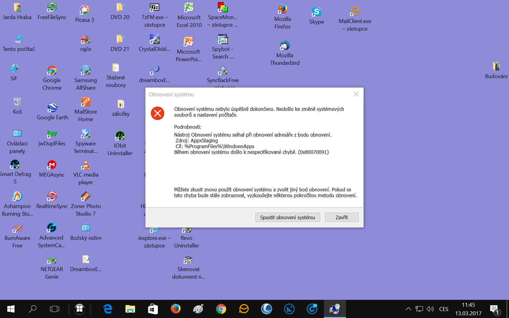 chtěl jsem obnovit systém WIN10 z 10.3.2017, ale píše mi to, že se obnovení nezdařilo. Zkoušel jsem i jiné body k obnovení - i jiné měsíce, ale stále mi to píše stejné --Nedošlo ke změně systémových souborů a nastavení počítače. Chyba 0x82270091. Vyzkoušejte pokročilou metodu obnovení.