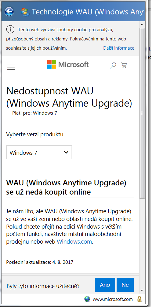 Potom mne zaujala funkce WAU a ze zvědavosti jsem to prozkoumal. Z toho, co jsem se dozvěděl, si jako laik si myslím, že podpora Win7 skončila. (viz. obrázek níže)
