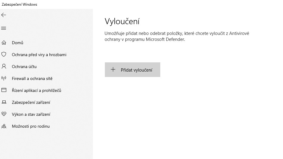Mám zobrazené pouze tlačítko +Přidat vyloučení, ale nejsou tam zobrazené složky které jsem měl nastavené jako vyloučené. Pokud dám přidat složku k vyloučení a přidám ji, nezobrazí se mi jako přidaná složka. Nevím jestli je přidaná nebo ne a také nevím jestli zůstaly složky mnou dříve nastavené jako vyloučené. Tím pádem také nemůžu složky z vyloučení vymazat.