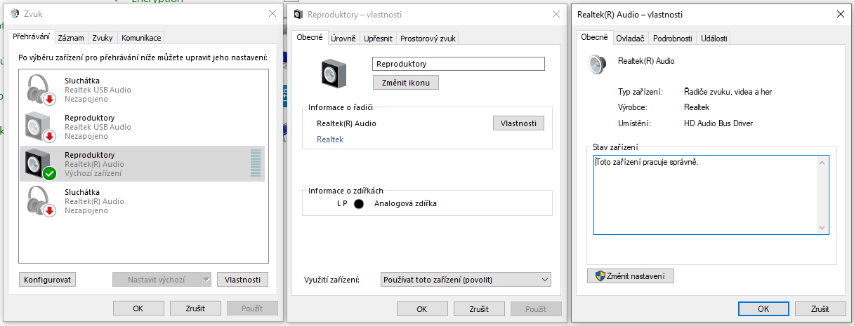 Ano, zobrazilo se to, kde jsem už byl - přes Ovládací panely. Jako výchozí (a jediné možné) zařízení je výše uvedený Realtek, test opět funkční, zvuk kdekoli jinde ale ne.