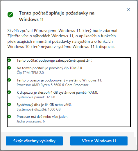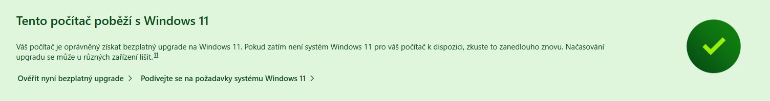 Otevřu Kontrolu počítače, dozvím se že můj PC je W11 kompatibilní.