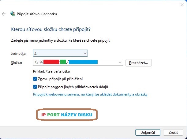 Poté, co jsem kvůli vadnému ssd přeinstaloval Win11, tak bych si chtěl opět nastavit disk z NAS Synology 1512 jako síťový. Vím kde se nastavuje síťový disk, vím, že aby ho viděl, musím nastavit u sítě ve Win "Privátní síť". Znám i IP adresu NASky včetně portu i názvu disku, pod kterým ho vidím v internetovém prohlížeči ve "File station" Možná mám jen drobnou chybu v zápisu, či tam chybí podstatná část. Jiné přihlašovací údaje dávám stejné jako jsou v dialogu, když se přihlašuji přes prohlížeč. Poradíte prosím?