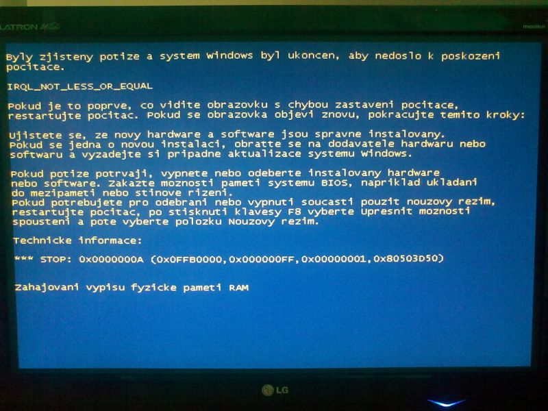 Ode mne se zatím nejedná o žádnou radu. Pokud mi pošle ty výpisy paměti, mohu ze zásobníku jádra zjistit, ve kterém modulu dochází k chybě a pak můžeme vymýšlet, co s tím. Chyba IRQL_NOT_LESS_OR_EQUAL je vcelku rozšířená chyba, ke které dochází, pokud rutina komponenty běžící v režimu jádra nesníží úroveň IRQL procesoru na kterém je vykonávána a snaží se provést některou z operací, která je nepřípustná při IRQL rovnajícím se nebo vyšším než IRQL DPC/DISPATCH. (např. zápis/čtení dat do paměťového prostoru některého procesu v user modu nevhodným způsobem, zápis/čtení do stránkovatelného paměťového fondu a ostatní akce mající za následek výpadek stránky v paměti, operace zapříčiňující přeplánování běhu vláken, čekání na některé synchronizační objekty atd.) Může to být způsobeno chybou v ovladači, poškozením kódu jádra nebo ovladače jiným ovladačem, virem, závadou pamětí či jiného hardwaru. Potřebujeme to trochu upřesnit.