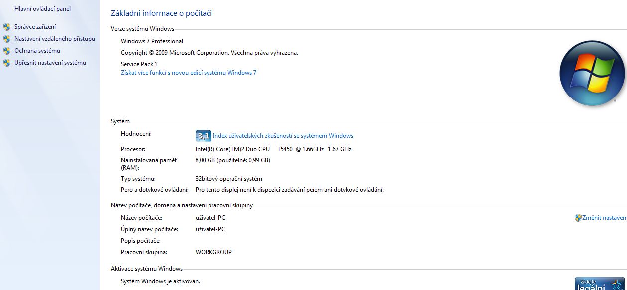 paměť RAM 8,00GB a z toho použitelná 0,99GB