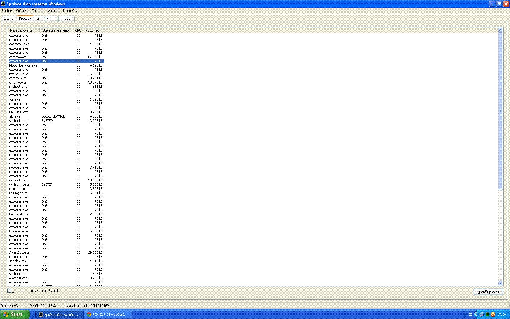 Ahoj dneska jsem přišel domů, dal vyčistit registry na ccleaneru a šel hrát. pak mě hra kopla a psalo to kraviny že nelze pokračovat.pak mě zmizely nekterý ikony kouknu do správce a tam je okolo 90 procesů zaplejch přitom nemám nic zaplého. Neustále se tam zapína dokola a znova explorer.exe Nevíte co s tím prosím??? Neustále to stoupá ted při psaní z 90 jsem na 125 normálně jsem míval kolem 35.. vic screen ty barvy jsou schválně kvůli velikosti