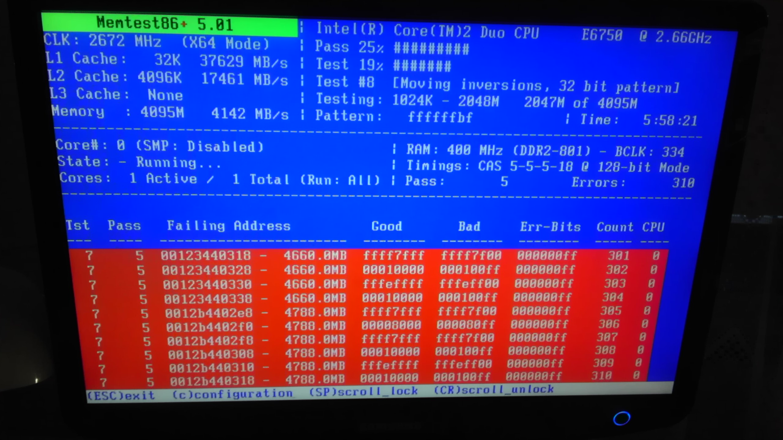 začala se mi stávat stejná věc, jak je zmíněna výše a tak jsem použil memtest 86+ a výsledek je za 5:58 hodiny, byly to 2x2GB DDR2 310 chyb. Předpokládám, že to asi říká, že mám paměti v prdeli že? :D dal jsem tam staré paměti a neukázalo to chybu ani jednu.