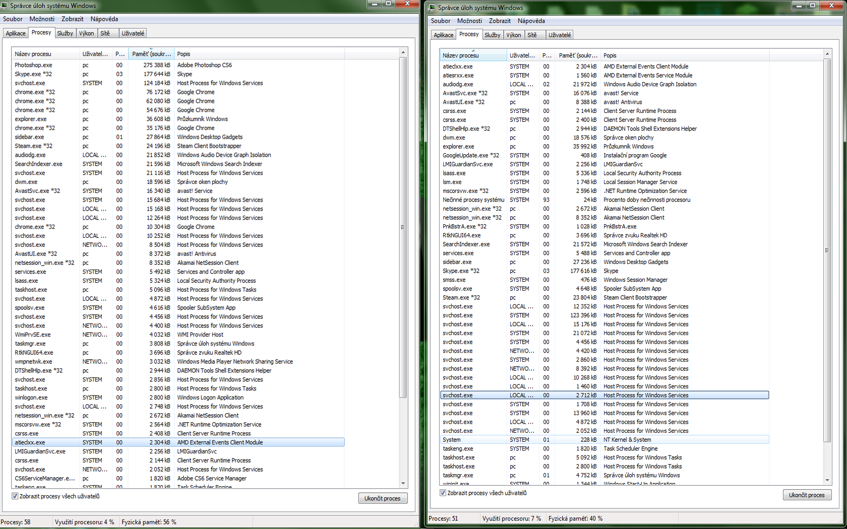 Myslím si, že tolik svchost, by nemělo být spuštěných při minimálním zatížení, jak je vidět, mám jen spuštěný skype + photoshop, nějaký ten gadget..