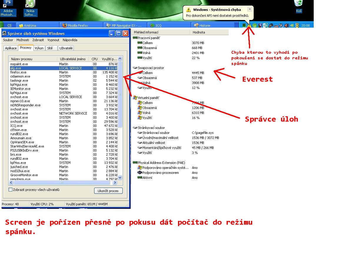 Ahojte,mám takovy problém s Režim spánku.V počítači mám 3 GB RAM.Na disku kde mam Winy mam volny 3 GB a na svym druhym mam volny 16 GB.Kdykoliv chci dat Režim spánku tak dám start - Vypnout Počítač pak zmáčknu Shift a dám Režim spánku.Vše se začne připrovat a místo nabihání takových modrých čárek se to vrati zpatky do Windowsu a hodi to chybu (viz. screen).Je to taky možné tím že mám Ramky GEIL 2x 512 Mb v dual slotu a potom v dalsim slotu 1x 2GB Kingston.Vsechny 3 Ramky jedou ale doposud mi fungovali i po přidání 2 GB Kingston RAM