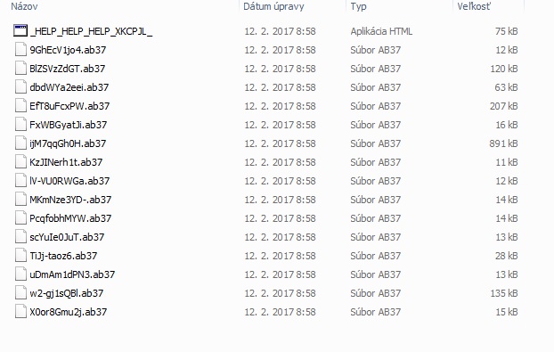 a vopred aj žiadam o pomoc ak by ktokoľvek vedel o čo ide alebo sa stretol s podobným problémom. Dnes ráno som si stiahol jednu E-knihu. No súčasťou bol bohužial aj vírus, tzv. Ransomware. Ide o "červený" typ. Zmení pozadie obrazovky na červený text s upozornením na stratu súborov a zakódovanie. Moje súbory skutočne zakódoval. Od fotiek, cez súbory wordu, excelu, pdfka, a pod. ... koncovky súborov zmenilo na súbory (.ab37), a v každej zložke sa nachádza súbor (_HELP_HELP_HELP_O6BZYRMR_) ide o html súbor.