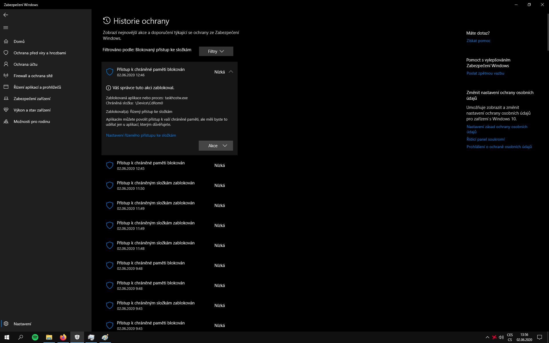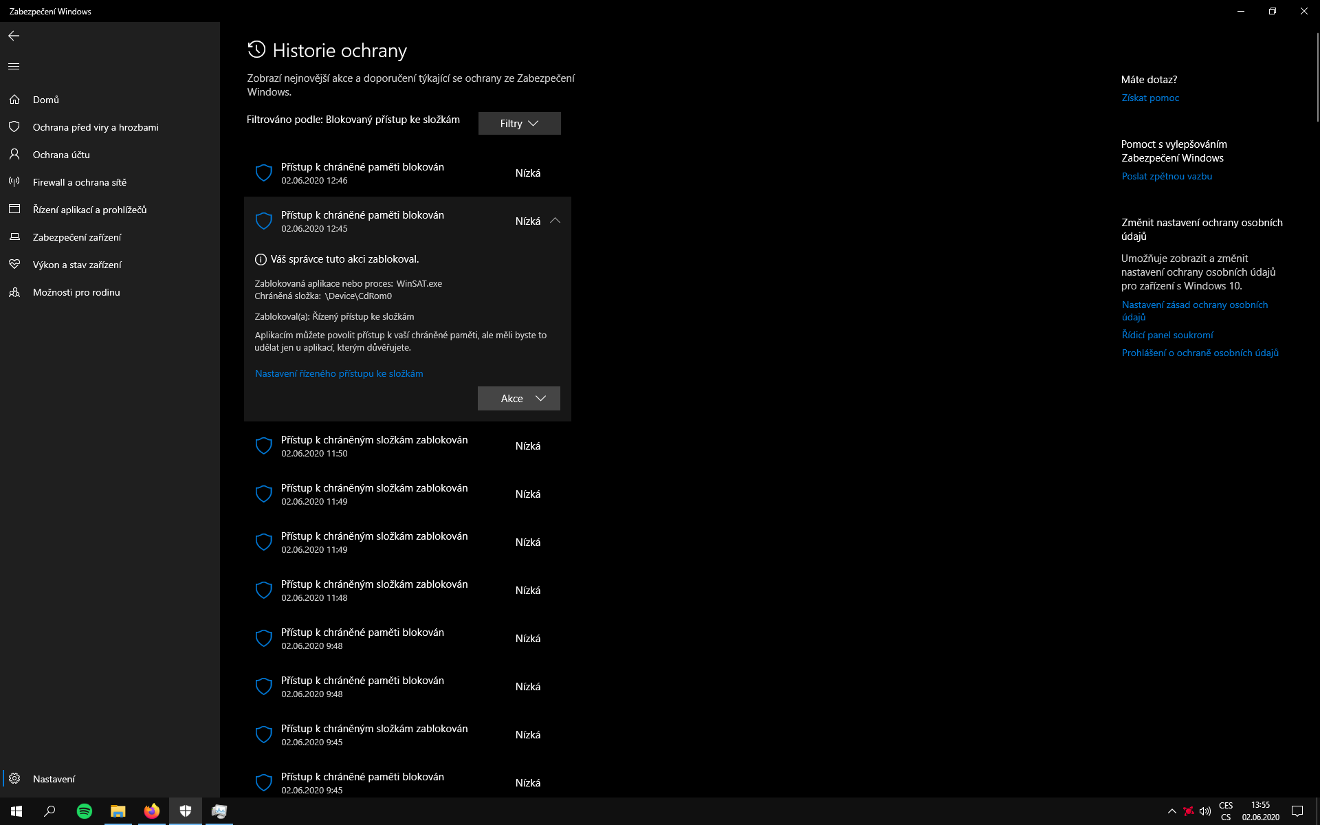 dnes mi Windows Defender vyhodil hlášku, že zakázal přístup ke chráněné paměti. Zablokoval dva .exe soubory (taskhostw.exe a WinSAT.exe), nevím proč. Když jsem se díval do historie tak párkrát WD už takto zablokoval. Soubory jsou umístěny tam kde by měly být tedy C:/Windows/System32. Chci se zeptat zda je to okay nebo možná nějaký virus, opravdu nevím. Obecně řízený přístup ke složkám mi blokuje všechny možné instalátory her a podobně, vše musím ručně vyloučit. Je to normální? (přikládám screeny).