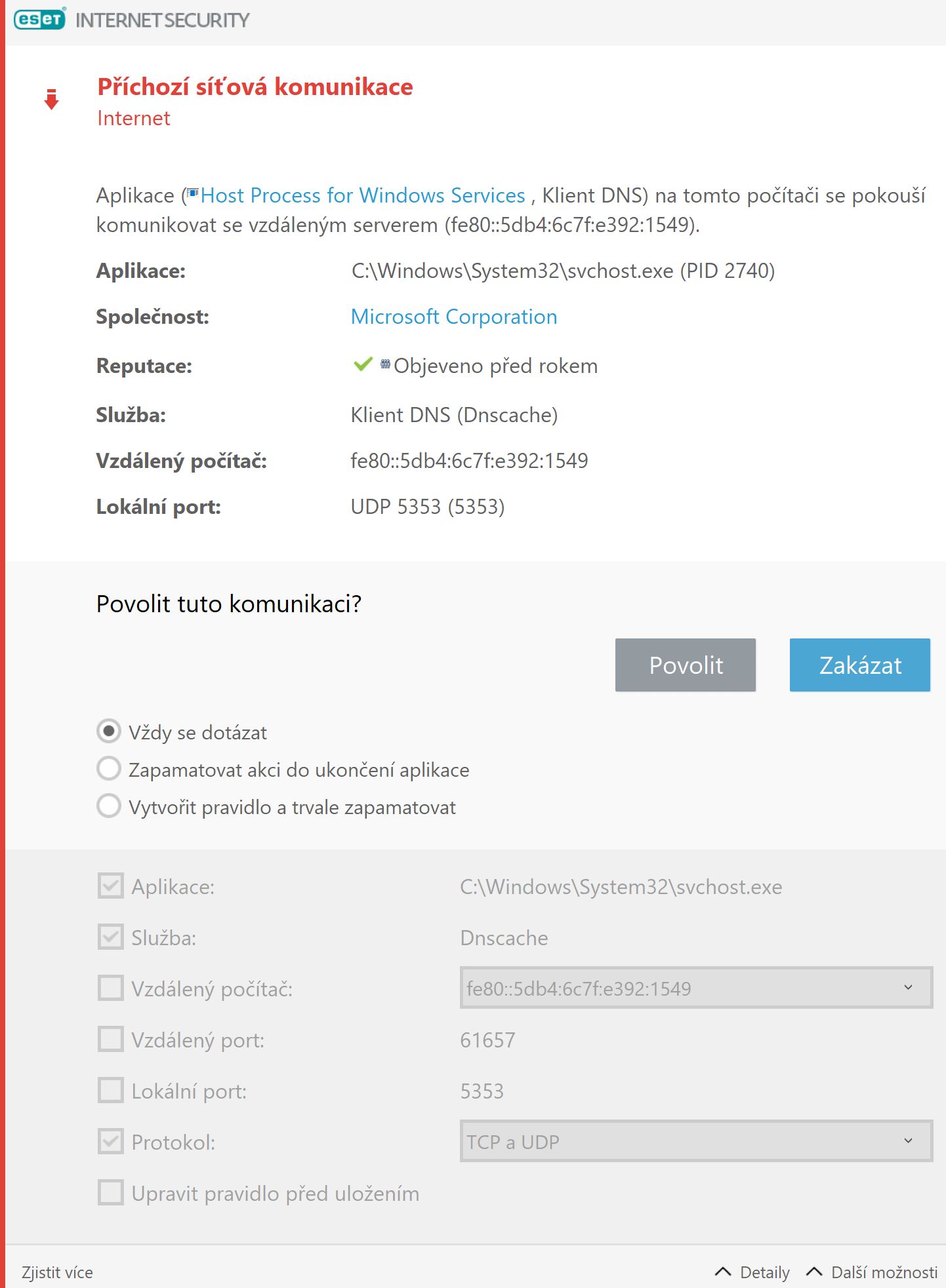 Když máš interaktivní režim, je dobré FW nastavit tak, aby původní Windows Firewall defaultní pravidla byly brány v potaz. Na první pohled to vypadá jako multicastový mDNS, ten využívá udp/5353, když klikneš na detaily, měl by si vidět číslo portu, můžeš sem poslat screen.