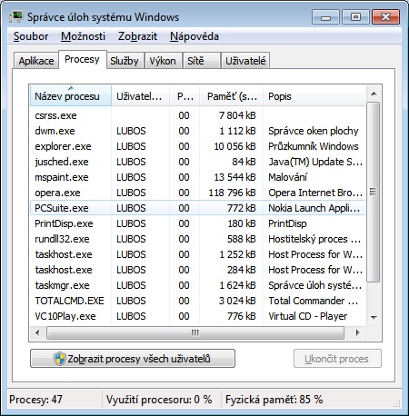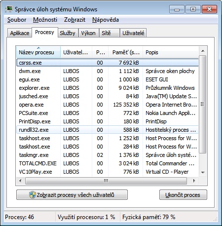 Tak jsem to zkoumal. EGUI je uživatelské rozhraní pro tento produkt a je spouštěn v režimu uživatele, proto je také vidět ve zmíněném výpisu (u uživatele LUBOS). Pokud přepnu výpis na všechny uživatele (tzn. i SYSTEM), tak se tam objeví i EKRN. A tento skutečně nejde běžným způsobem ukončit. Akorát mi není jasno, proč při odinstalaci ESETu (NODu) nelze tuto odinstalaci dokončit. Mě to šlo normálně (dělal jsem to asi před dvěma týdny) a bez chybového hlášení. Jde vůbec o legální verzi? Není pro aktualizaci virové databáze spuštěn i nějaký jiný program (třeba ESET Key finder), který tomu brání?