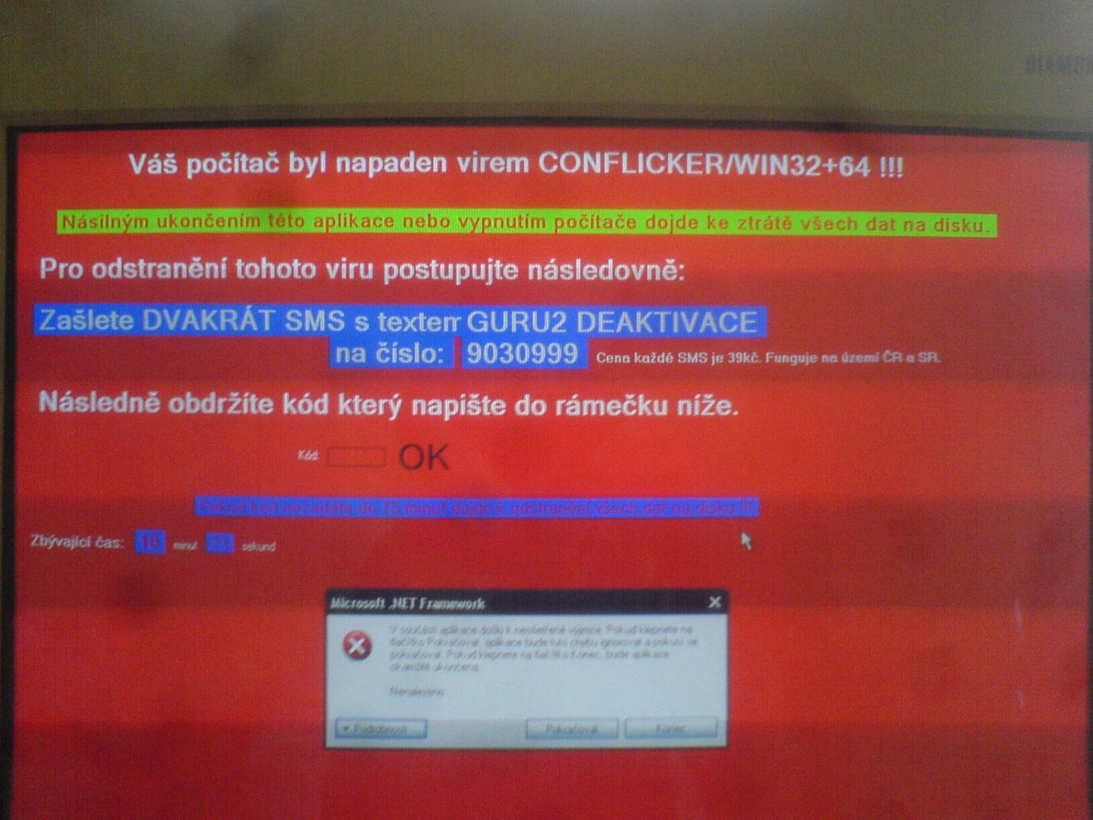 Ahoj, dnes jsem zapnul pocitac a rozsvitila se mi cervena obrazovka ze mam pc napadeny virem Conflicker/win32+64 a ze mam zaslat nejakou sms za 39kc jinak mi to smaze hdd. Pocitac jsem okamzite vytahl ze zasuvky a spustil ho ve stavu nouze, pak jsem dal bod obnoveni systemu. Ted mi teda pocitac jede snad normalne ale potreboval bych se tohoto viru nejako zbavit. Prosim poradite mi jak?