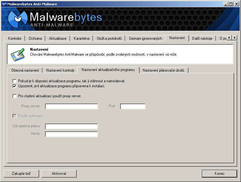 Jakou verzi MBAM máš? U 1.75.0.1300 stačí když si nastavíš MBAM viz. obr. Musíš ale po nainstalování zrušit, že chceš provést aktualizaci programu. Nejdříve si to přenastav a pak udělej ručně aktualizaci.