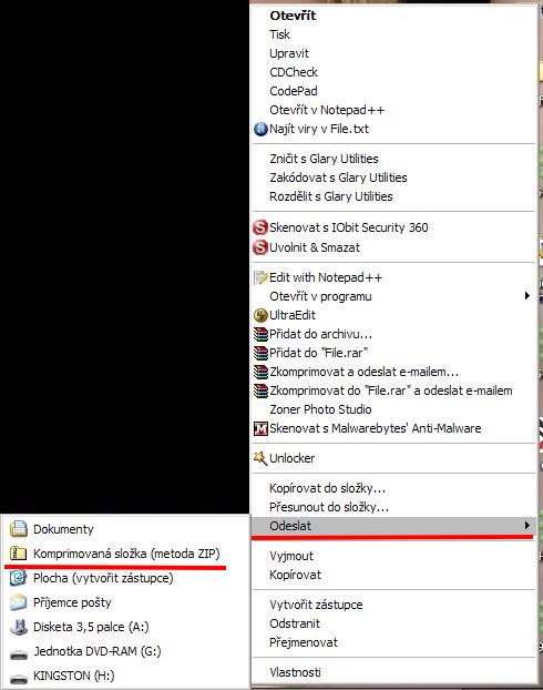Na ten soubor File.txt klikni pravým myšítkem a z nabídky vyber Send (Odoslať) a zvol metodu ZIP. Viz obrázek, orientuj se podle ikony.