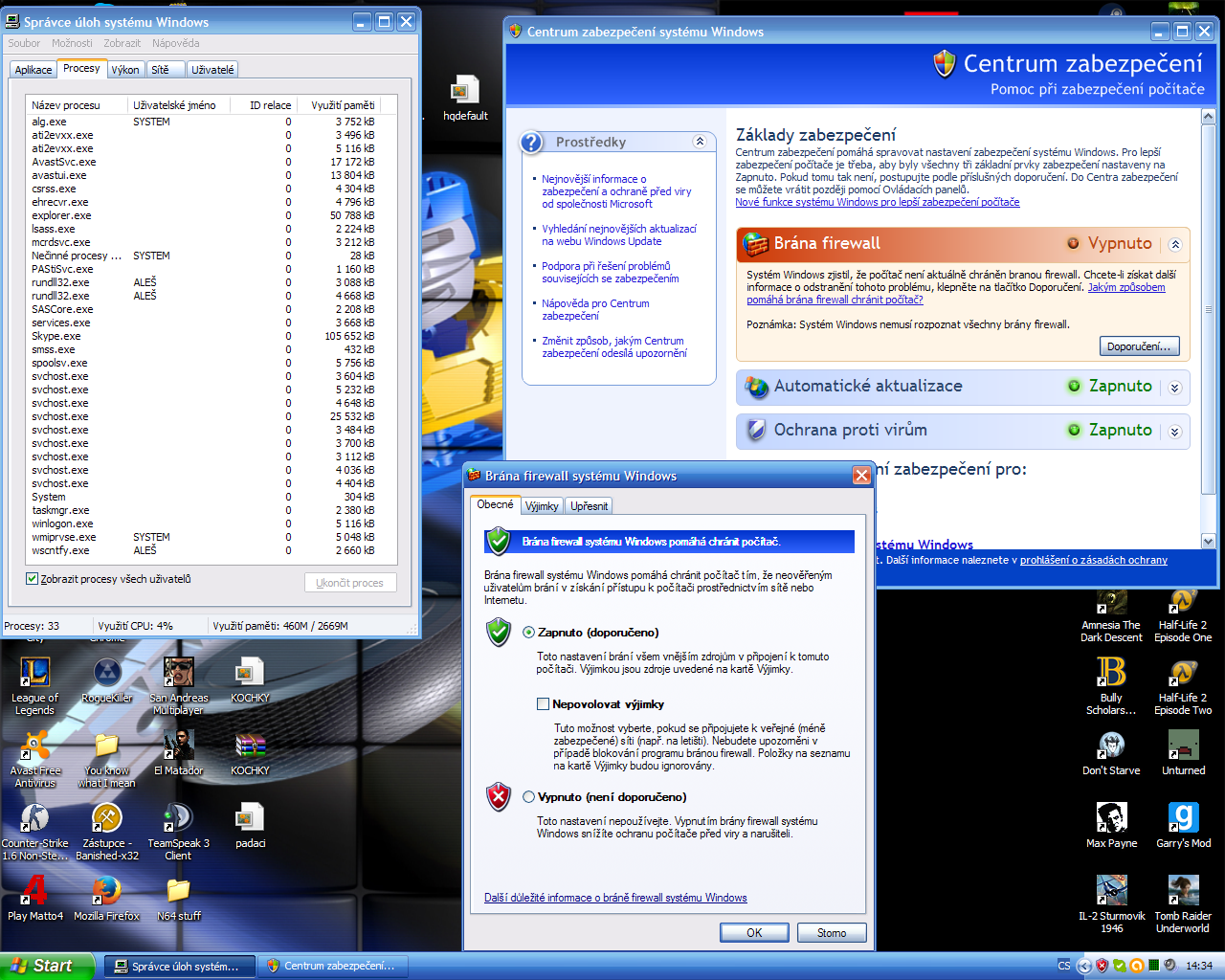 Zdravím. Dnes jsem zapl počítač a potom si odběhl za kamarádem. Za cca hodinu jsem se vrátil. Zjistil jsem že mi nejde internet. Tak jsem se podíval do síťových připojení a můj internet se tam nenacházel. Spustil jsem průvodce nastavením sítě pro domácnost a odklikal. Pak jsem restartoval pc a internet jde. Jenže mi vyskočilo upozornění na liště že není zapnutý firewall. Když jsem koukal do nastavení, firewall zapnutý je. Toho upozornění se nejde zbavit, je to proces wscntfy.exe a nejde ukončit. Zajímavá věc je, že když ho v správcí procesů vypnu, tak se uživatelské jméno změní na SYSTEM a když to udělám znova, tak to má jméno mého účtu.