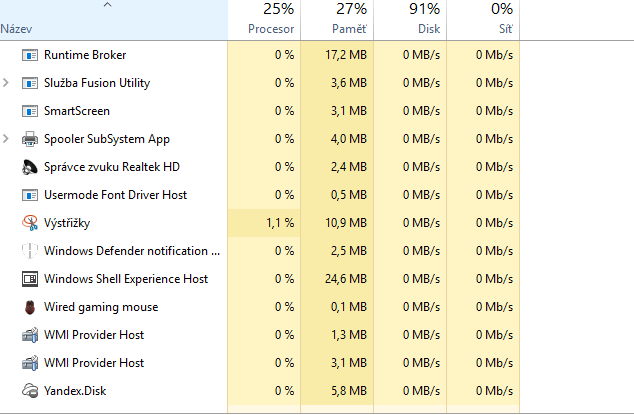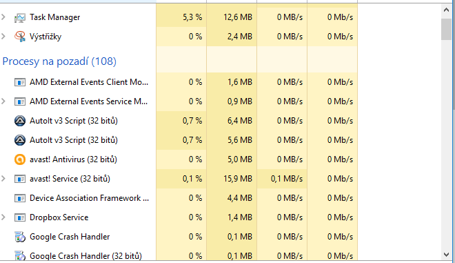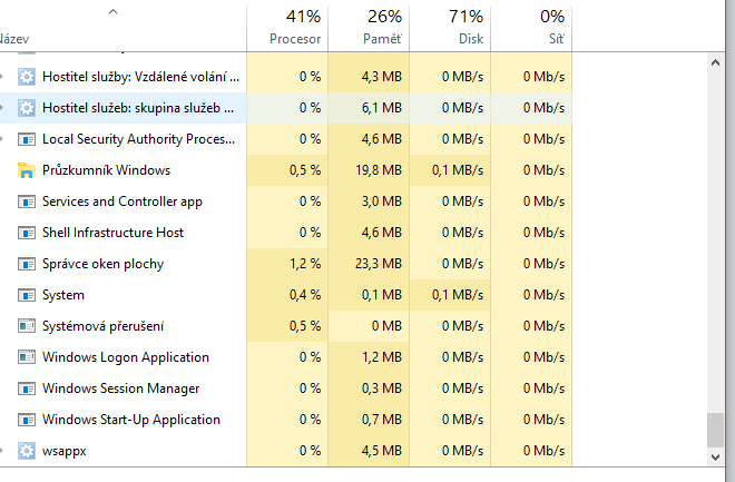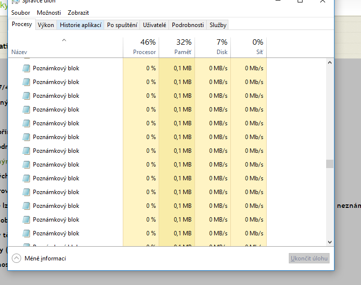 EDIT: Tech procesu poznamkovy blok je zapnuto spise tak 50. Vsechny maji vytizeni procesoru 0,1% a pamět 0,1MB