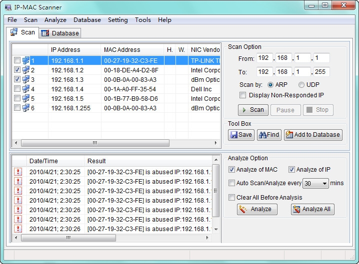 AthTek IP – MAC Scanner can fast scan your network for IP addresses and MAC addressess including DHCP connections. It can also find suspicious clients among hundred of connections in seconds. It can scan the whole network by UDP or ARP, and backup the detailed scanning results to database.