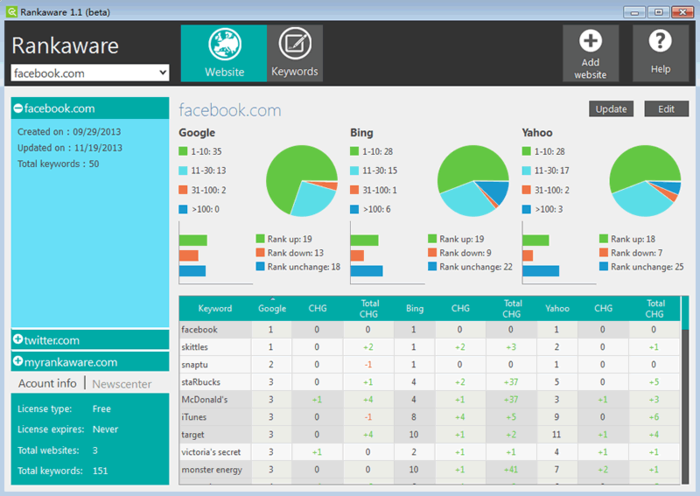 Rankaware is an SEO tool that makes keyword rank checking and monitoring fast and easy. This keyword rank checker software performs batch SERP position checking for targeted keywords on Google, Yahoo, Bing and tracks keyword ranking performance over time. Using intelligent self-learning technology, Rankaware is able to provide accurate results in intuitive charts and tables and generate scheduled, professional, customizable SERP report in different formats.