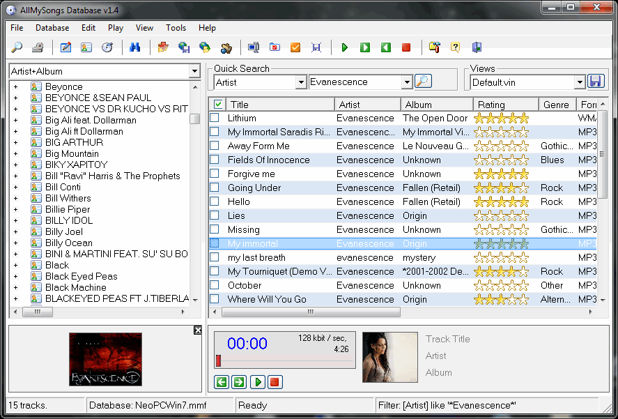 AllMySongs Databáze je hudební knihovna pro správu a katalogizaci hudebních souborů a AudioCD. Podporuje formáty MP3, WMA, OGG, WAV atd. Můžete snadno najít nějakou píseň z hudební sbírky podle názvu, alba, interpreta, žánru apod. nebo jakékoliv složité podmínky. Také si můžete stáhnout obaly, fotky umělců ad. Dnes hra: Inca Ball
