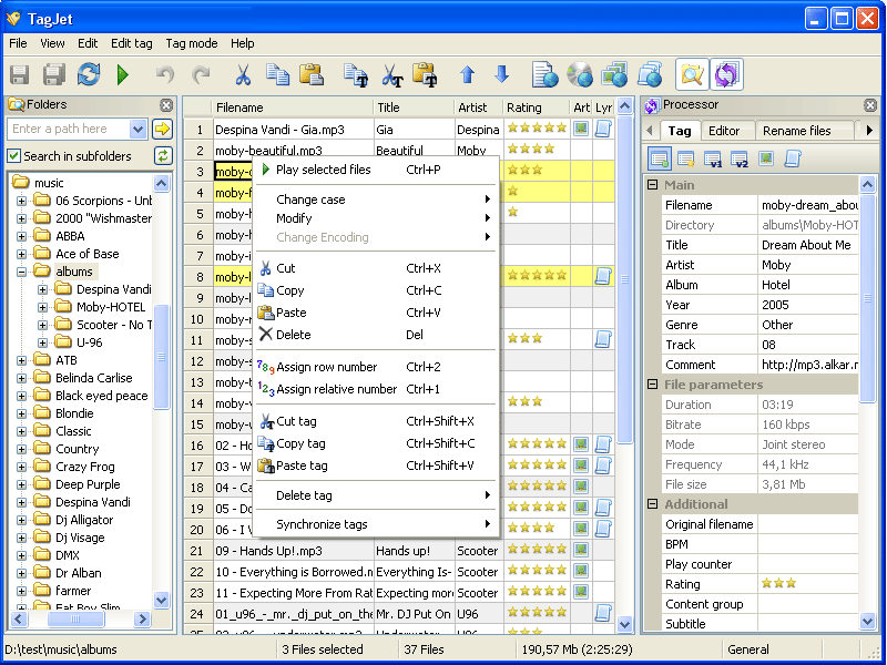 TagJet je tabulkový MP3 Tag editor, kterým lze identifikovat stopy a celá alba a pak automaticky přidávat k nim komentáře, alba a texty. Stejně tak má široké možnosti ruční editace a schopnost dělat všechny operace v dávkovém režimu.