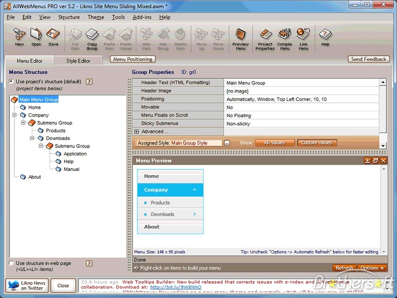 AllWebMenus Pro je aplikace, která Vám pomůže vytvořit menu pro Vaše webové stránky. Nemusíte přitom napsat ani řádek kódu, AllWebMenus Pro udělá vše za Vás, vy jen zvolíte podobu menu. Menu mohou být horizontální i vertikální, rozbalovací i jednoduchá, prostě přesně podle vašich představ a to samozřejmě včetně barevného provedení.