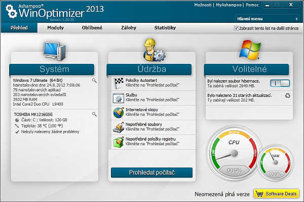 Plná verze programu Ashampoo WinOptimizer 2013 vám pomůže vyčistit počítač od zbytečných záznamů v registru Windows, odstranit nepotřebná data z pevných disků, zrychlit internetové připojení i zvýšit soukromí a zabezpečení dat v počítači. Soubor optimalizačních nástrojů WinOptimizeru je připraven diagnostikovat aktuální problémy snižující výkon vašeho počítače a nabídnout vám automatické řešení. Doslova na jedno kliknutí myší s ním provedete základní kroky s vyčištění a optimalizaci výkonu počítače. Mimo to je připravena i řada dalších zajímavých nástrojů, například na odstranění pozůstatků po surfování na internetu, šifrování a bezpečné mazání souborů nebo testování výkonu počítače.
