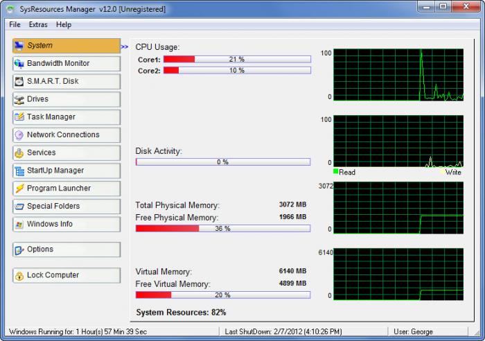 SysResources Manager je systémový nástroj pro sledování aktuálního stavu důležitých systémových prostředků, jako je využití procesoru, paměti RAM a virtuální paměti dostupnost, zdraví pevného disku a výkon, aktivní a procesy přístup k Internetu, monitorování šířky pásma (provoz Download-upload rychlost), služby, Programy po spuštění.