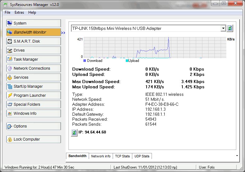 SysResources Manager je systémový nástroj pro sledování aktuálního stavu důležitých systémových prostředků, jako je využití procesoru, paměti RAM a virtuální paměti , Hard Disk zdraví a výkonnosti, aktivní procesy a procesy přístup k internetu, monitorování šířky pásma provozu (Download-Upload rychlost), Služby, Programy po spuštění.