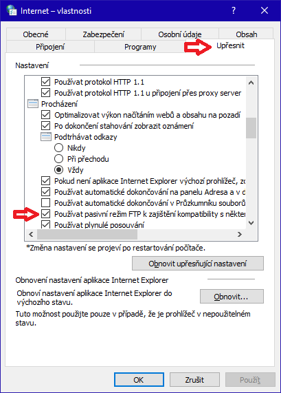 2. Nastav ve woknech ftp na pasivní režim (screen).