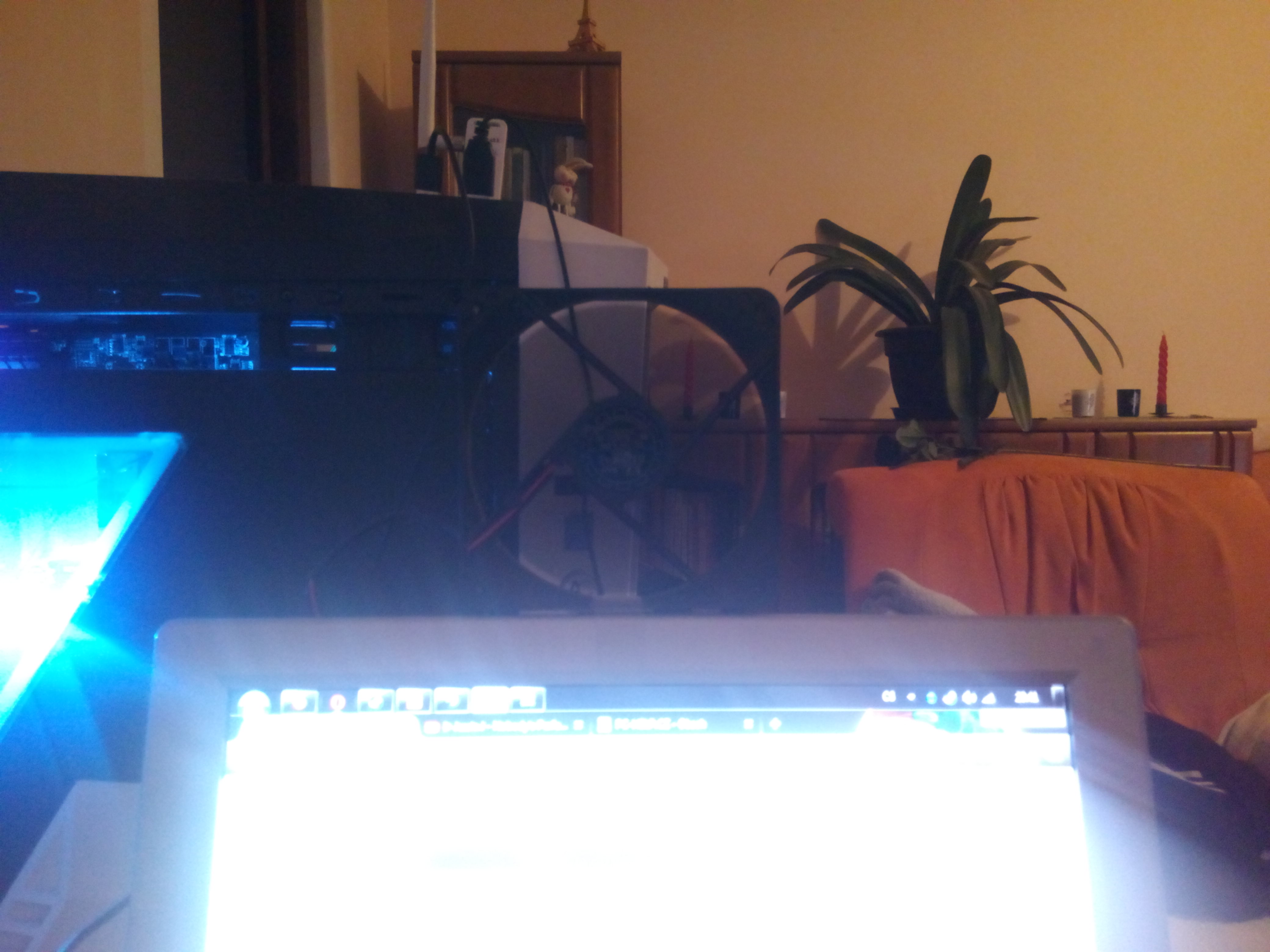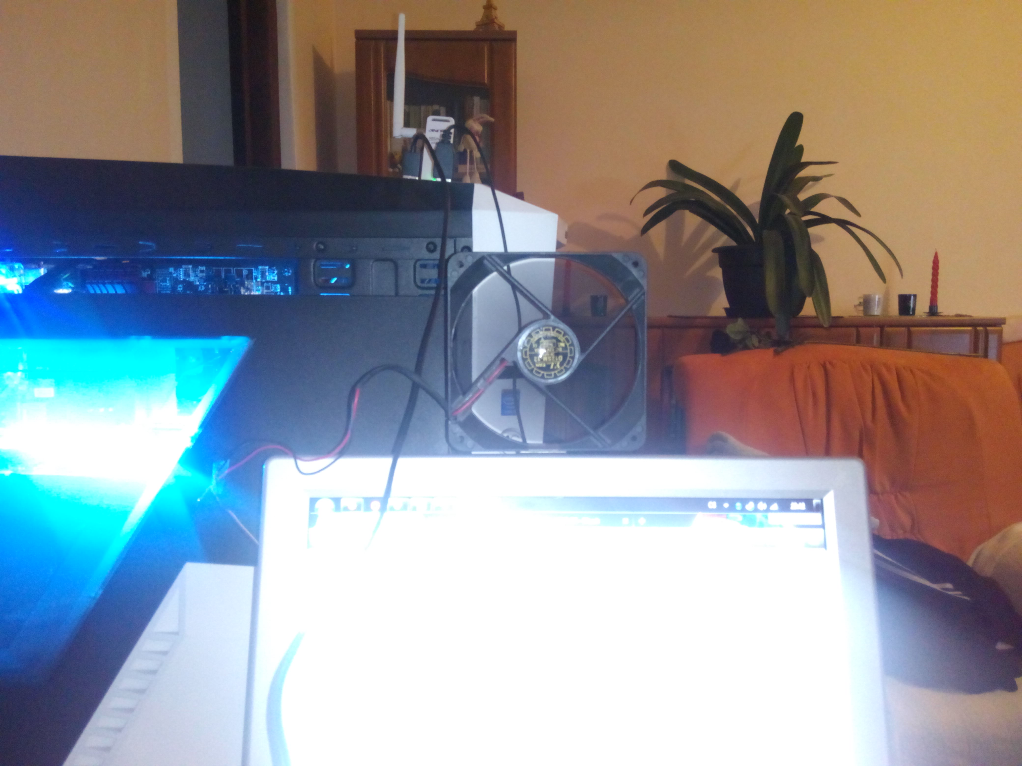 Takže sem si našel větrák (mam ještě asi dalších 8 ) a zapojil ho do regulátoru. Ten sem následně vypodložil klínem aby byl rovně a foukal na mě (monitor mám hodně nakloněn takže...)