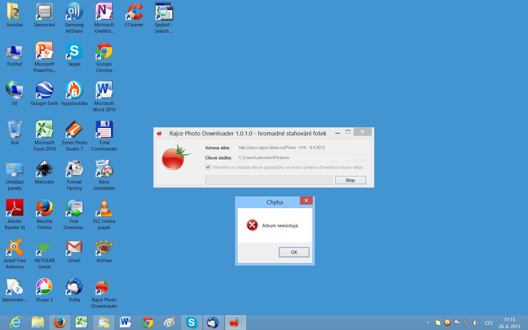 Dobrý den. Nahrál jsem si Rajce Photo Downloader 1.1.0 - hromadné stahování fotek. Chtěl jsem to využít a nepochodil jsem. Zasílám obr., kde je vidět co jsem kam napsal. Také je vidět, že alba existují, tak nevím, proč mi to píše, že alba neexistují. Děkuji za případné rady, co dělám chybně. Hezký den.