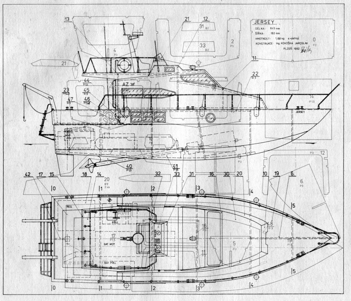 Já jsem cca 2-3 roky dělal svoji první loď na vysílačku. Ale pak přišel v roce 1995 počítač a já jsem ji rozestavěnou odložil. Jelikož jsem měl už 5 půlmetrových lodí ze stavebnice (pořárnický člun, závodní člun, jenž měl s požárním shodný "podvozek", rybářský kutr Olaf, motorový člun Korál a kluzák Jiskra na CO2), chtěl jsem něco většího. Proto jsem vzal plánek na jachtu Jersey a zvětšil jsem ho z 645mm na 1200mm. Bylo to spočítaný tak, abych se vešla přepravní bedna s lodí na zadní sedačku do Škody 105. Místo původního jednoho motoru jsem instaloval 2x Graupner Turbo 700. Na napájení jsem použil 2x 4,2Ah olověný aku. Loď je víceméně hotová, ale potřebuju domontovat komponenty, zalepit okna a hlavně ji nalakovat. Vše na stavbu mám. Jen aku budou po 15 letech nejspíš na vyhození. Jelikož se motor při zátěži silně zahřívá, vyrobil jsem pro každý motor z 1m 5mm AL trubky chladící spirálu. Původně jsem to chtěl chladit vodou z rybníka, ale nyní bych použil asi uzavřený okruh a radiátor z vodníka.