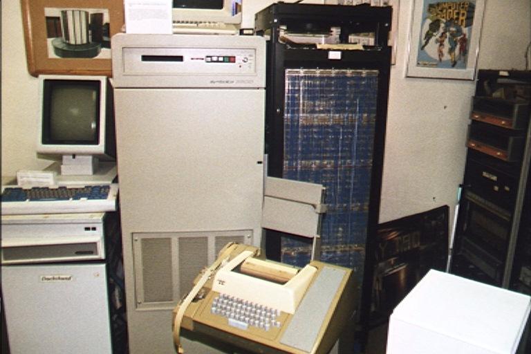 Za povšimnutí stojí stejné dálnopisné terminály jako je na obrázku výše, mohlo jich být připojených současně až několik desítek a stejný počet uživatelů mohl s počítačem najednou pracovat!
