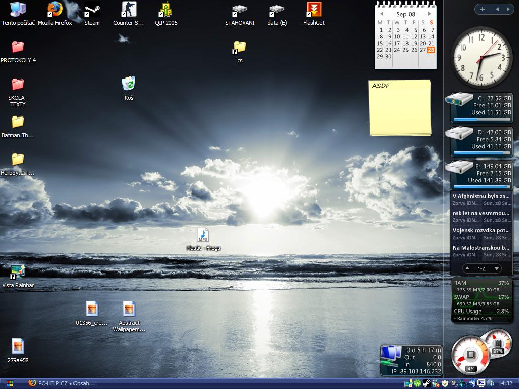 tak tady posílám i svojí plochu. Je vidět na co používám o prázdinínách PC, ale až začne školní rok (29.9.), tak to bude horší. To tam budou jen soubory a ikony spojené ze školou.