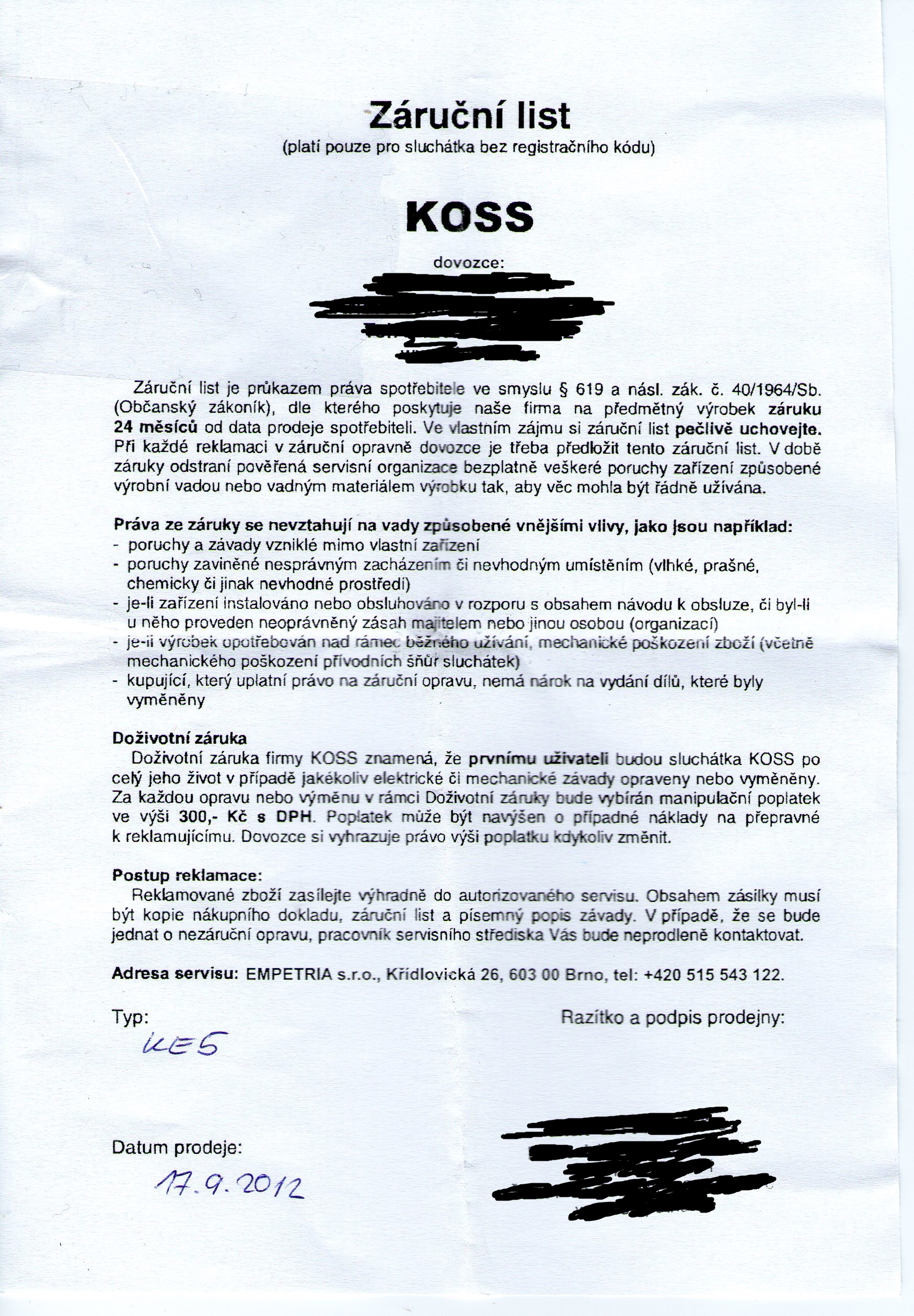 Já jsem již jednou reklamovl sluchátka KOSS a když jsem si šel vyzvednout asi po měsíci nové, které mi zaslaly výměnou kus za kus, tak jsem k tomu dostal ještě papír, jehož obsah mě celkem zarazil ohledně doživotní záruky. Přikládám jako přílohu.