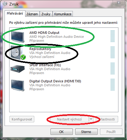 Momentálně mám nastavené jako výchozí (u mě zelená fajfka a černé označení) reproduktory od počítače. Takže nyní slyším zvuk od počítače. Pokud by jsi chtěl, aby jsi slyšel zvuk od televize, vybereš televizi, jako výchozí (u mě zelené ohraničení).