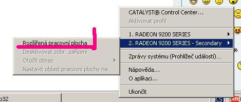 5) v Catalyst Center zvol režim Rozšířená pracovní plocha - buďto klikem pravou myší na ikonu vpravo dole a vybráním podle obrázku, který už tu jednou byl, nebo přes Start > Nastavení > Ovládací panely > ikona Zobrazení > karta Nastavení > klik pravou myší na obrazovku s číslem 2 a vyber Rozšířit plochu na tento monitor - nebo tak nějak se to jmenuje;