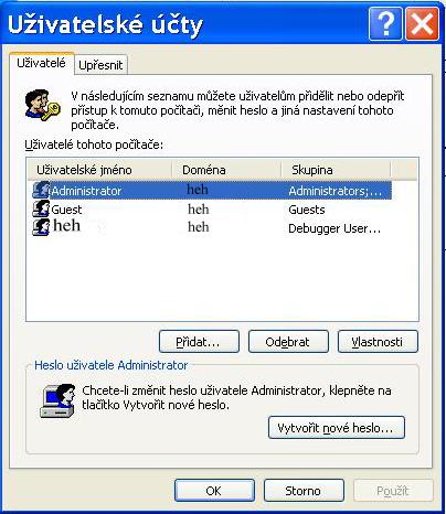 Když klikne na uživatele 'heh' (ten třetí), dá vytvořit nové heslo zadá si tam něco a potvrdí. Potom když se chce přihlásit tak to nejde , ale musí se při přihlašovací obrazovce (ta stím ctrl+alt+del) dát něco jako síť na heh1 místo toho co tam měla a to jí potom vytvroří celou jinou plochu, jakoby nového uživatele.. prosím poraďte :wink: Dík