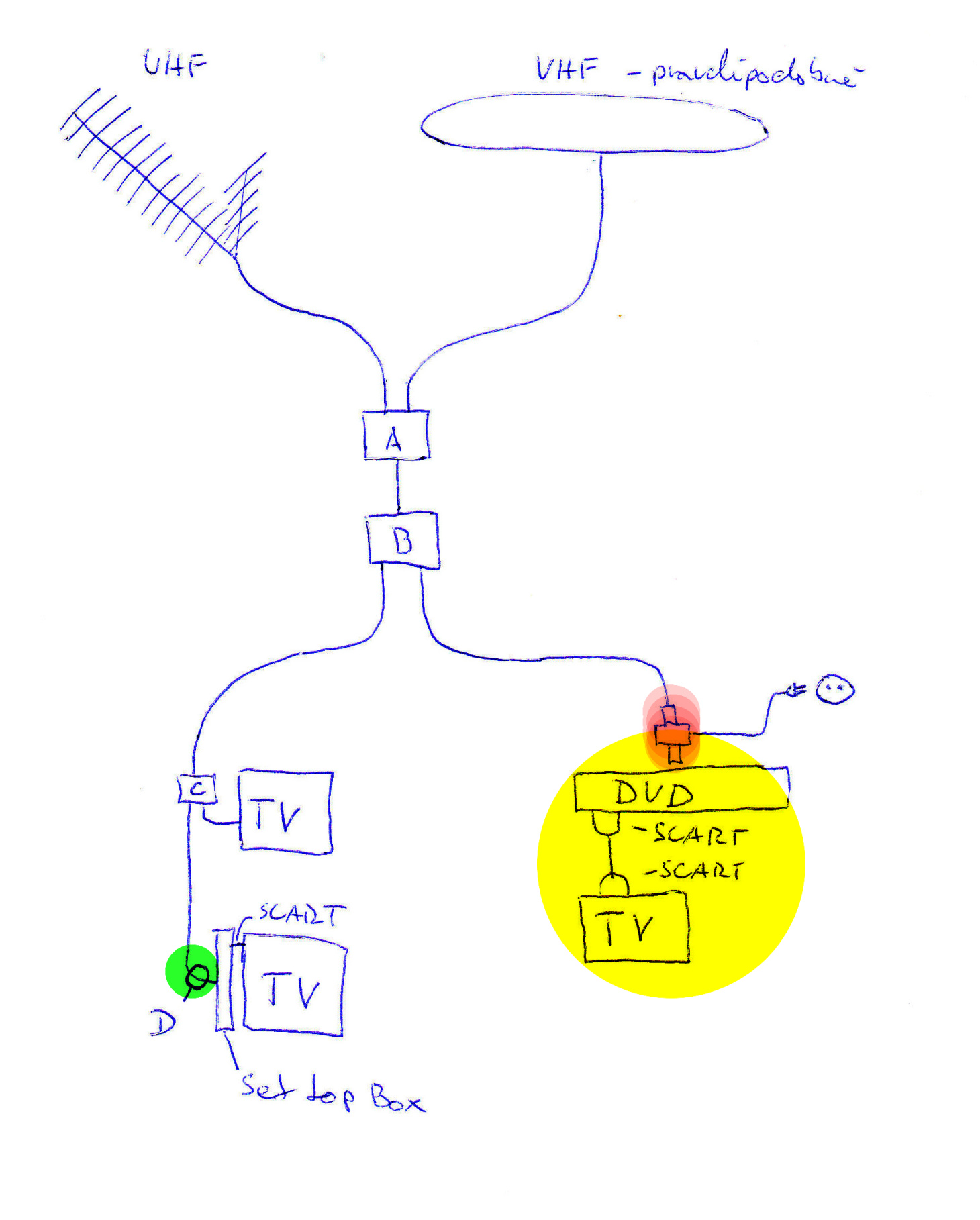 Ahoj, v příloze je k vidění schéma, které fungovalo. Po rozpojení v červeném bodě a přehozením toho napájení (nevím co to vubec je) do zeleného bodu, již nechytám žádný signál. Žluté přístroje jsou nyní napojeny na satelit - tam problém není. Ovšem na zbylých dvou televizích není signál (digitální vysílání).