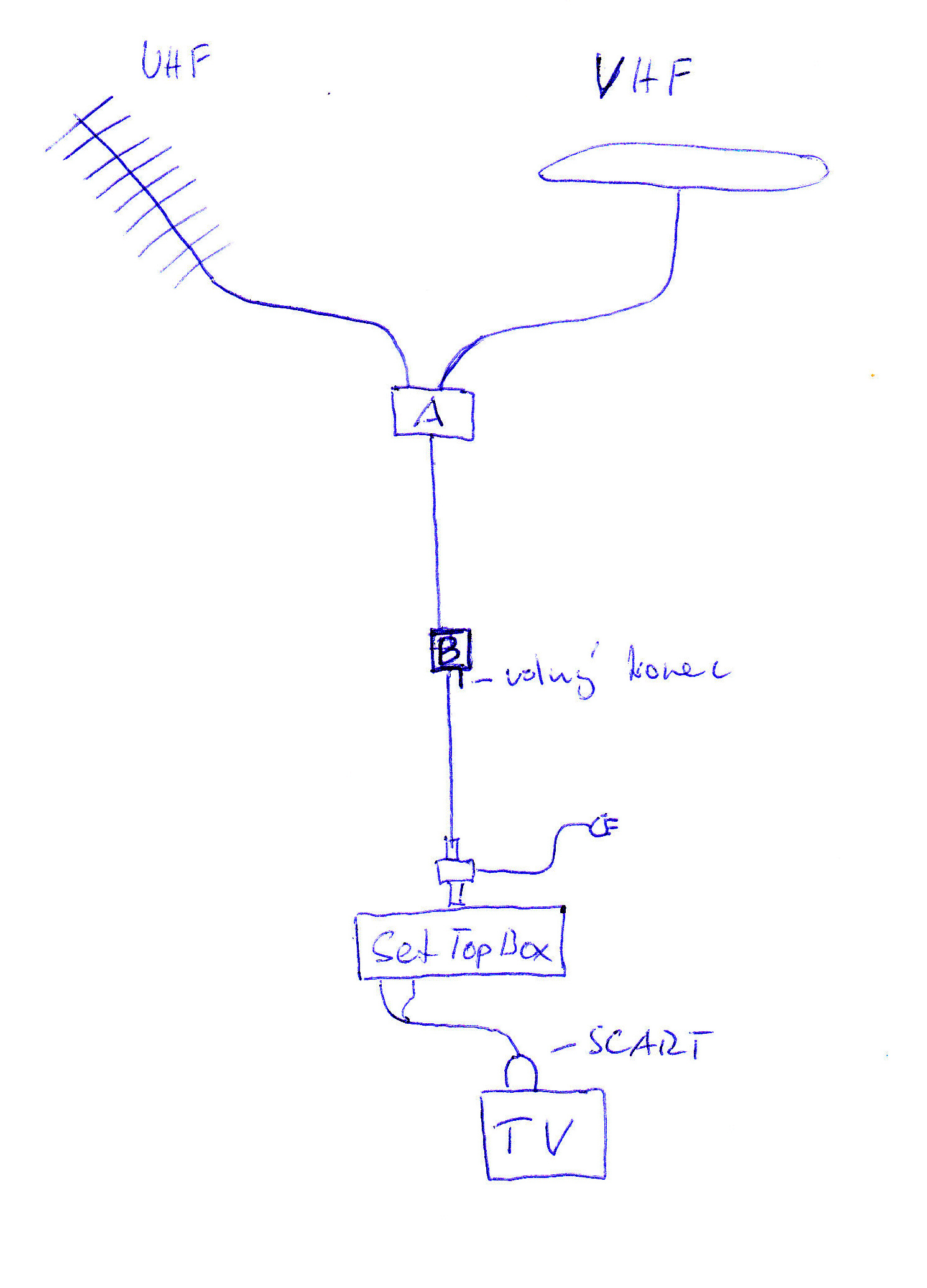 Anténa -> A -> B -> napájení -> set top box