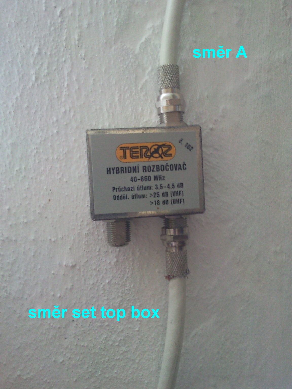 Rozbočovače (B,C) mají většinou jen jeden výstup, přes který projde napájecí napětí pro anténní zesilovač. Měl by být označen.