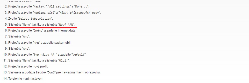 Začnu od začátku. Přešel jsem k Sazka mobilu a mám tarif, kde mám data do 200MB. Dnes jsem se chtěl připojit, ale bohužel mi to nešlo. Zanedlouho mi přišla zpráva, kde se psalo, ať kontaktuji samoobsluhu. Šel jsem na jejich stránky a tam je návod přesně na můj mobil (Lenovo A850). Jde vše, až do 3. bodu, kde si nevím rady, co mám dělat. Mám tam přepsat nějaké APN, ale tu kolonku mám zamčenou, nejde s ní nic dělat. Nevíte, jak mám postupovat? Předem děkuji za odpoveď.