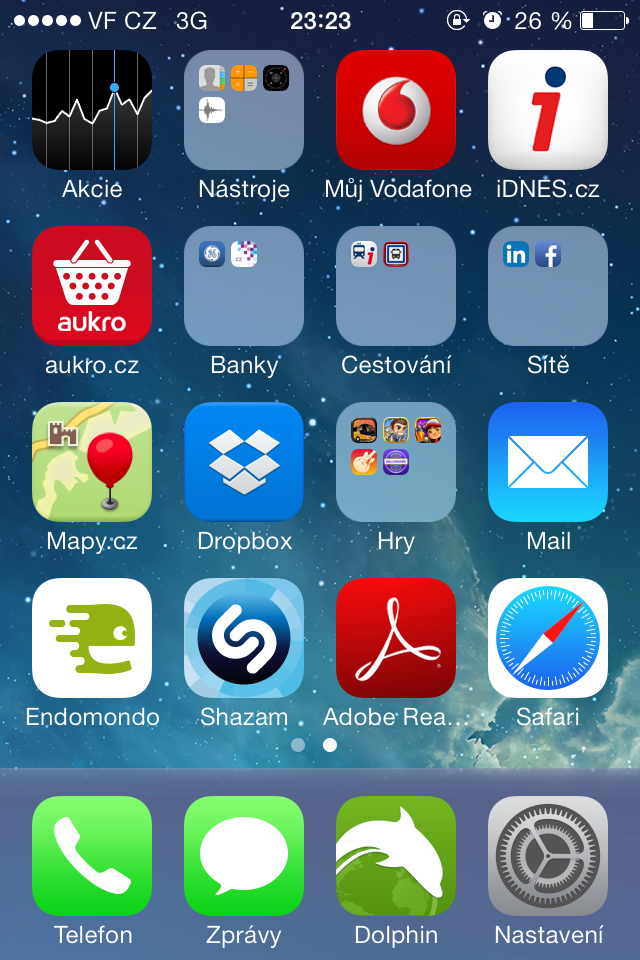 Za sebe můžu říct, že se mi úvodní obrazovku ještě nepodařilo uspořádat tak, aby mi vyhovovala. Nemůžu najít správný poměr mezi přehledností a potřebným počtem aplikací. V uspořádání na obrázku se pořád dost ztrácím