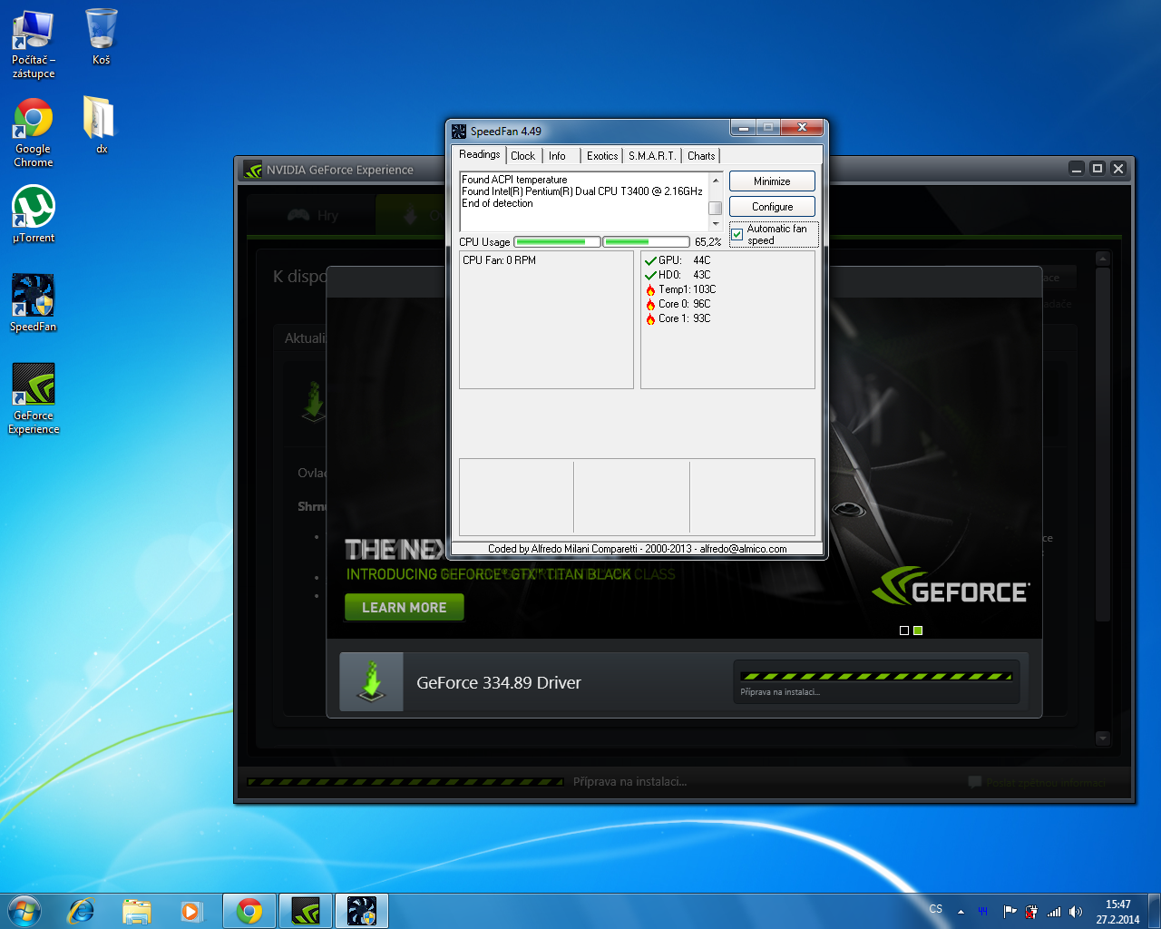 Hele tak větráček tam mam a pastu bych řekl že spravně nanesenou mam , nedělal jsem to poprvý :) no sam se koukni jak to vypada v přiloze , po zformatovani disku a nahrní windowsu po cca 30 minutách jen pri instalaci ovladače grafiky :)