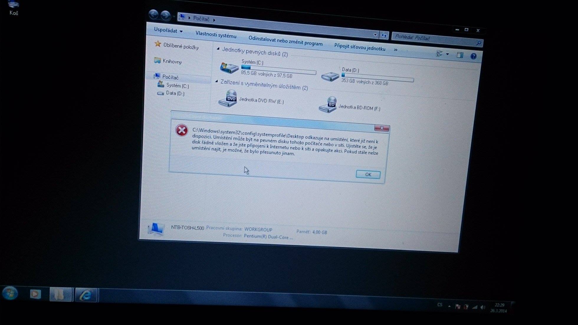 Zdravím před pár dny jsem si z ulozto stáhl písničku jenže to nejspíš byla nějaka forma viru okamžitě se mi začli mazat data z disku tak jsem vypnul pc. Poté co jsem ho zapnul tak tam místo mého uživatelského účtu byl účet "uživatel" na které absolutně neznám heslo. Jakoby můj účet zmizel a vytvořil se tam nějak ten "uživatel". Avšak když jsem pomocí jednoho návodu na youtube chtěl odemknout tenhle účet tak v commandu přes usb byli vidět i mé ostatní účty. Účty jsem teda odemkl ale hned po tom co to naskočí na plochu vypadne hláška která je tady v obrázku. Absolutně nevím co s tím na HDD to ukazuje ze některá data tam zůstala. Nevíte někdo jak treba obnovit disk nebo něco podobného? Za jakékoli info děkuji.