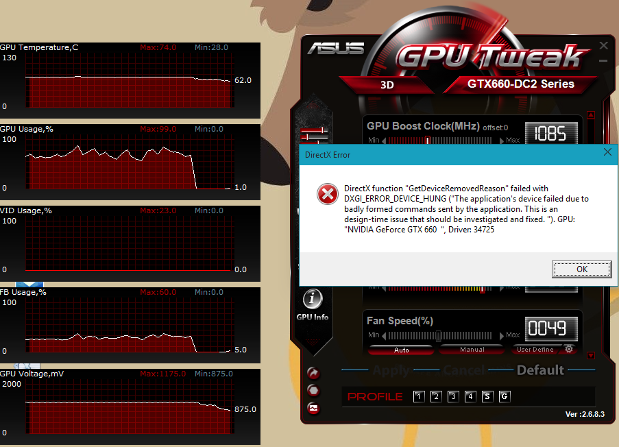 mám problém s grafickou kartou NVIDIA GTX 660. Stává se to ve hrách. Spustím hru (je jich více, které to dělají) a začnu normálně hrát. Po nějaké chvíli, se hra začne neuvěřitelně sekat. audio podivně chrčet, a hra stane se nehratelnou. Občas pomůže jít na plochu a za chvíli zase zpět, ale je to obtížné, protože v tu chvíli se seká všechno. Když toto zabere tak hra zase běží dobře a nebo se stane to, že spadne a v notifikacích vyskočí: Grafický ovladač přestal pracovat a byl restartován. Zkusil jsem tedy grafický ovladač přeinstalovat, donwgradovat na starší vezi i updatovat (děje se mi to už nějakou dobu), ale chyba stále opravena nebyla. Nainstaloval jsem si i officiální ovladač, který je dodávaný k této grafice a pořídil několik snímků, když se to začne sekat. Pro příklad je to vyzkoušeno na hře Need for Speed Rivals, které mám koupené na Originu. (Tato hra dokonce při rozchození spadne na nějakou chybu, které též moc nerozumím, ale ta chyba je pouze u této hry. Sekání se projevuje všude).