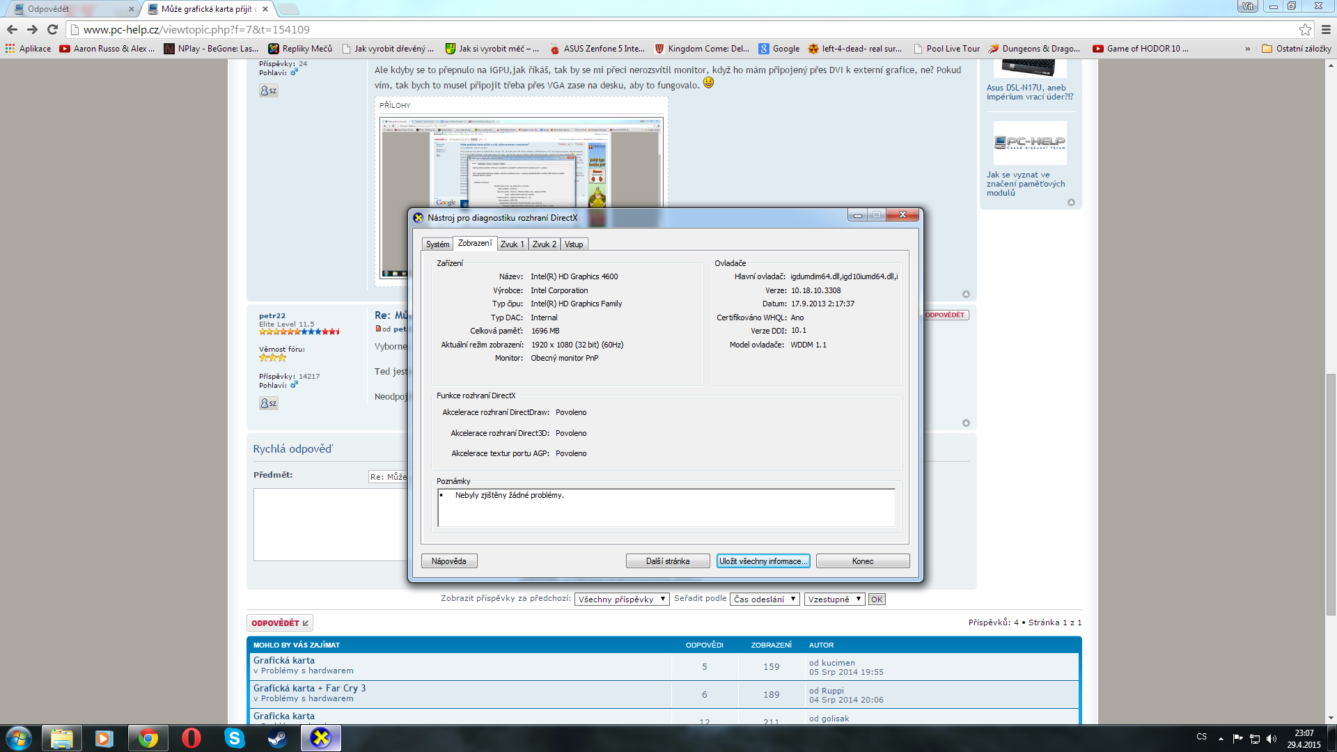 ), zase ho zapnul a zjistil, že jsem udělal obrovskou chybu. Za prvé, teď se nedostanu do BIOSU, protože když PC zapnu, po dobu bootování Windowsů se nerozsvítí monitor, ten se rozsvítí až při přihlasování se k uživatelskému windows účtu. A za druhé, když jsem po vysání v PC spustil GTA V, jako obvykle, byl jsem dost v šoku. V nastavení grafiky ve hře jsem si všiml využitelné grafické paměti. Místo klasické kapacity cca 3000MB, kterou by moje GK (R9 280) měla mít, byla max. kapacita grafické paměti pouze cca 1600MB. I když jsem dal všechno nastavení na normal, vypnul vyhlazování atd. , zapnul jsem benchmark, hra běžela v průměru pouze na cca 10-15FPS. Podotýkám že předtím jsem hry jako Skyrim, GTA V a další podobně náročné hry hrál většinou na vysoké až nejvyšší nastavení.