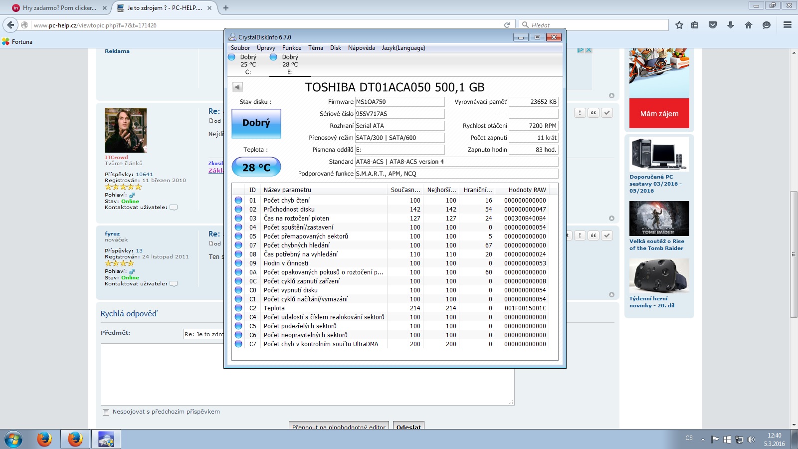 Minulý týden se mi PC začal zasekávat a dlouho startovat. Problém se každým dnem zvětšoval a jakákoliv aplikace startovala čím dál tím déle i několik desítek minut. Myslel jsem že to bude HDD (Western digital 500GB , 3,5 , SATA) a tak jsem si objednal nový (TOSHIBA 500GB, 3,5 , SATA). Dočasně jsem si připojil svůj starý disk (Western digital 80GB, 3,5, SATA) a problém již nebyl. Ale po připojení nového disku se opět problém vrací.